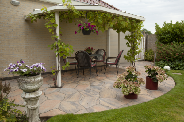 Doordat de toplaag van deze tegelserie een leisteenprofiel heeft en door de vorm van de tegel, heb je altijd een uniek en natuurlijk ogende tuin.