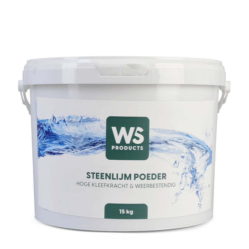 Weerbestendige lijm met hoge kleefkracht voor het verlijmen van bijvoorbeeld betonnen muurblokken, borders van gebakken bestrating of natuursteen stapelelementen. Daarnaast zeer geschikt voor het “aanbranden” van keramische tegels. De onderkant wordt ingesmeerd met een dunne laag, vervolgens in de drainagemortel gelegd en met een rubberen hamer ingeklopt waardoor de tegels goed vastliggen. WS Steenlijmpoeder is extra vloeibaar tijdens gebruik, gedraagt als een pasta en niet als een kleverige mortel, en hard het snel uit na verwerking.